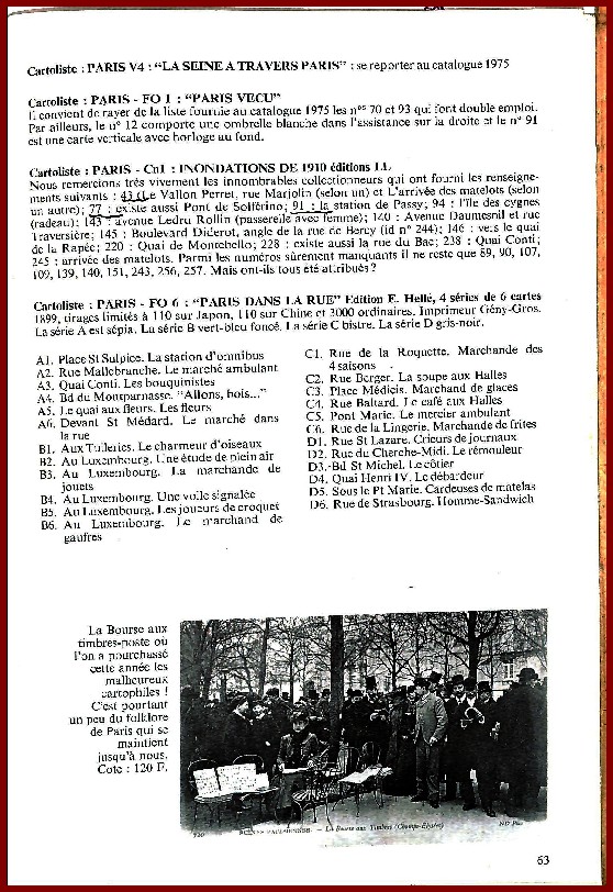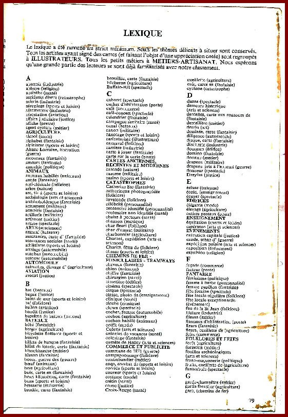Le catalogue proprement dit qui comprend 38 rubriques, soit : • AGRICULTURE (AG) • ANIMAUX (AN) • ARTS ET SCIENCES (AS) dont Histoire (H) • AUTOMOBILES – AUTOBUS • ATTELAGES (AU) • AVIATION (AV) • BATEAUX (B) • CARTES ANCIENNES (A) • CARTES RECENTES(R) • CARTES MODERNES (M) • CATASTROPHES (Ca) (Ci) (Cn) (Cf) • CHEMINS DE FER – TRAMWAYS • FUNICULAIRES (CT) • COMMERCE ET PUBLICITE (CP) • EDIFICES (E) • ENSEIGNEMENT (EN) • ETRANGER (ET) • EVENEMENTS (EV) • FANTAISIES (F) • FOLKLORE ET FETES (FO) • GUERRE (G) • ILLUSTRATEURS (IL) • INDUSTRIE (IN) • JUSTICE (J) • METIERS ARTISANAT (MA) • MILITAIRES, SUJETS (MI) • MODE ET COSTUME (MC) • MUSIQUE (MU) • NATURE (N) • PARIS (PARIS) • PECHE ET VENTE DU POISSON (PE) • PERSONNALITES (P) • POLITIQUE (PO) • POSTE ET TELECOMMUNICATIONS (PT) • PRESSE ET AFFICHES (PA) • RELIGION (RE) • SANTE PUBLIQUE (SP) • SPECTACLE (S) • SPORTS ET LOISIRS (SL) • VILLE (V)