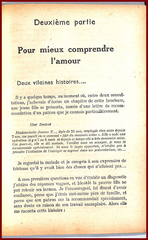• Rédigée pour des jeunes gens de 20 ans, elle comporte des explications très précises sur tout ce qui a trait à l’amour, dans l’ordre physique et dans l’ordre sentimental. J’ai pensé qu’il valait mieux être complet puisque par ailleurs, le soir, à la, chambrée, les uns et les autres abordent n’importe quel sujet devant n’importe qui.