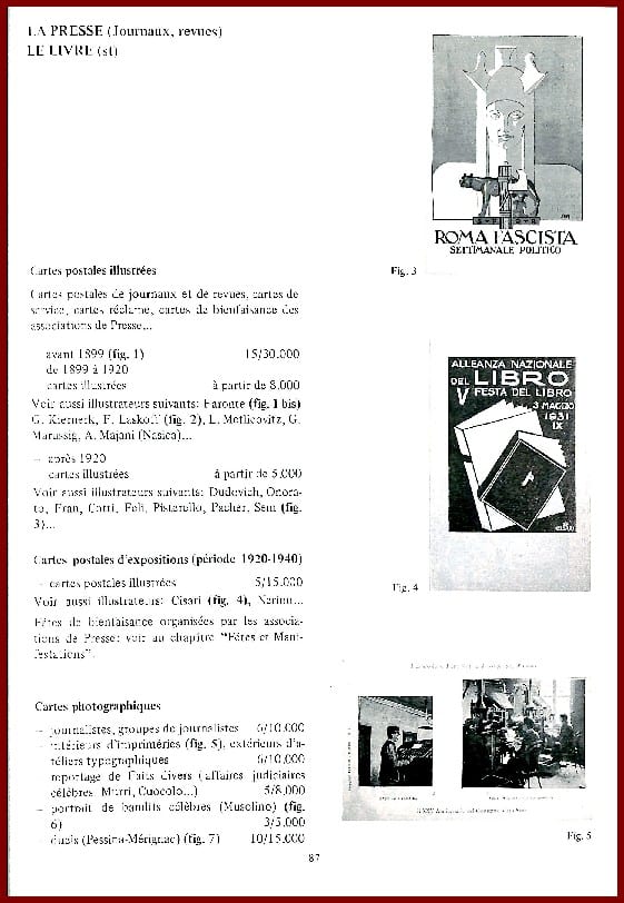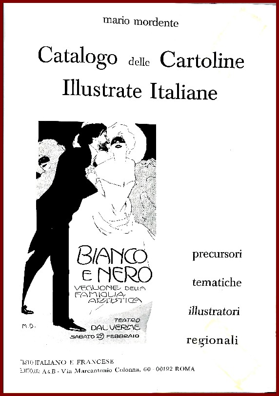 Le second traite des principaux thèmes de la cartophilie italienne. • Dans la troisième partie du catalogue nous avons répertorié et coté les “illustrateurs” par ordre alphabétique et cherché en outre à donner, en nous aidant de reproductions photographiques, un aperçu des différents styles d’illustration qui se sont succédés du début du siècle jusqu’à la Deuxième Guerre mondiale.
