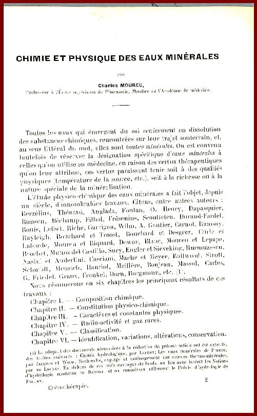 D’accord avec lui, nous avons demandé aux Prs Armand Gautier, Moureu et de Launay, dont on connaît les beaux travaux sur l’origine, la constitution physico-chimique et la géologie des Sources, d’exposer l’état actuel de nos connaissances sur ces importants sujets.