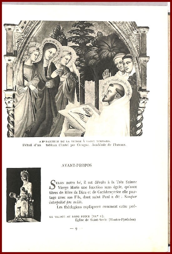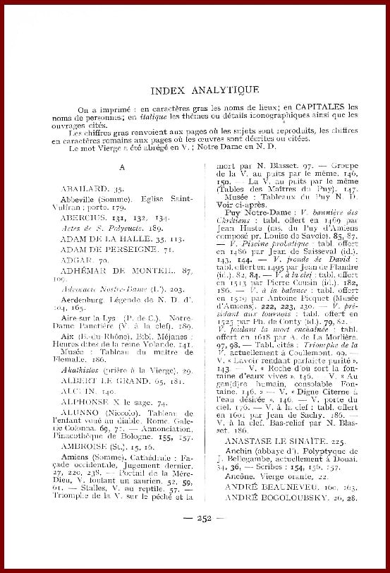 • Avant-Propos • Chapitre Ier. — L’idée et l’image de la Vierge médiatrice DES ORIGINES AU XIIe SIÈCLE • 1. — La Médiatrice dans l’Eglise Anténicéenne avant 325 . . • 2. — L’Orante des Catacombes • 3. — La Théotokos aux mains suppliantes • 4. — Saint Bernard, docteur de la Vierge Médiatrice. Son influence au moyen âge • Chapitre IL — La Vierge au Serpent • 1. — La légende et les symboles du Serpent • 2. —• Iconographie de la Vierge au Serpent • 3. — Le symbolisme de quelques œuvres • 1. — La Vierge qui frappe dur • 2. — La Vierge au bâton ou à la massue. La légende de l’Enfant voué au diable • 3. — La Vierge guerrière • Chapitre IV. — La Vierge aux chaînes • 1. — Les Rédemptions spirituelles • 2. — La Vierge entraînant la Mort et le Mal. Le thème des Chars de Triomphe • 3. — La Vierge des prisons • Chapitre V. — La Vierge au manteau • 1. — Le Manteau Palladium • 2. — Quelques Vierges au manteau, d’intérêt historique et iconographique • 3. — Le Manteau et les flèches de pestilence Chapitre VI. — La Vierge a la Fontaine • 1. — La Vierge source de vie • 2. — Iconographie de la Vierge à la fontaine ou au puits . Chapitre VII. — La Vierge a l’encrier • 1. — L’hommage de l’encrier à Notre-Dame • 2. — Les Vierges à l’encrier • 3. — Le symbolisme des Vierges à l’encrier • Chapitre VIII. — Porte et fenêtre du Ciel. La Vierge AUX CLÉS ET A L’ÉCHELLE • 1. — Porte, fenêtre, pont du ciel • 2. — La Vierge aux clefs • 3. — La Vierge à l’Echelle • Chapitre IX. — La Médiatrice de l’au delà. La Vierge A LA BALANCE • 1. — L’Avocate au Jugement particulier • 2. — L’argument maternel de la Vierge avocate • 3. — La descente de la Vierge aux enfers • 4. — La Vierge à la balance • Bibliographie ’ • Index analytique