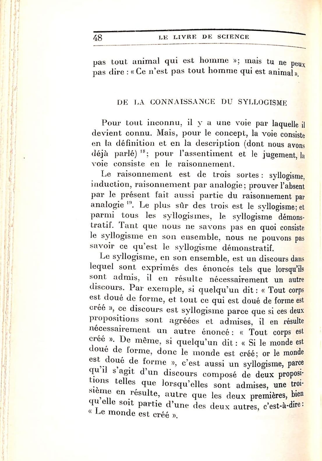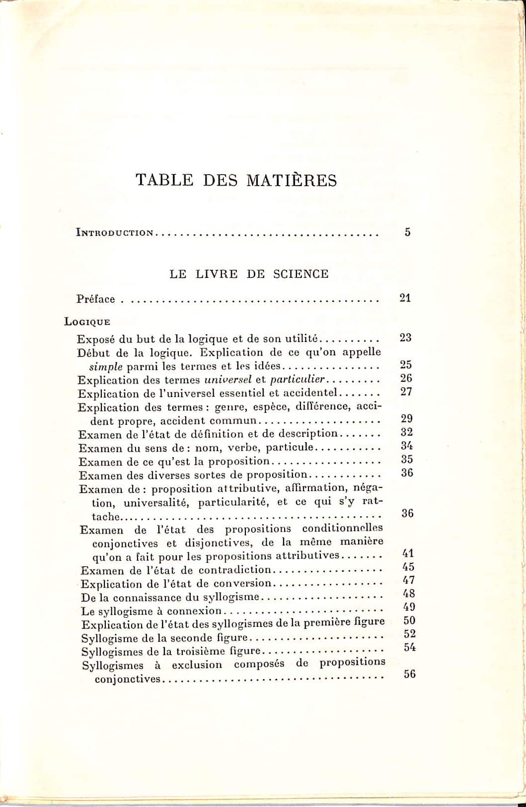 • Préface • LOGIQUE • Exposé du but de la logique et de son utilité • Début de la logique. Explication de ce qu’on appelle simple parmi les termes et les idées • Explication des termes universel et particulier Explication de l’universel essentiel et accidentel • Explication des termes : genre, espèce, différence, accident propre, accident commun • Examen de l’état de définition et de description Examen du sens de: nom, verbe, particule Examen de ce qu’est la proposition Examen des diverses sortes de proposition Examen de: proposition attributive, affirmation, néga- tion, universalité, particularité, et ce qui s’y rattache • Examen de l’état des propositions conditionnelles conjonctives et disjonctives, de la même manière qu’on a fait pour les propositions attributives • Examen de l’état de contradiction Explication de l’état de conversion De la connaissance du syllogisme Le syllogisme à connexion Explication de l’état des syllogismes de la première figure Syllogisme de la seconde figure Syllogismes de la troisième figure Syllogismes à exclusion composés de propositions conjonctives • •