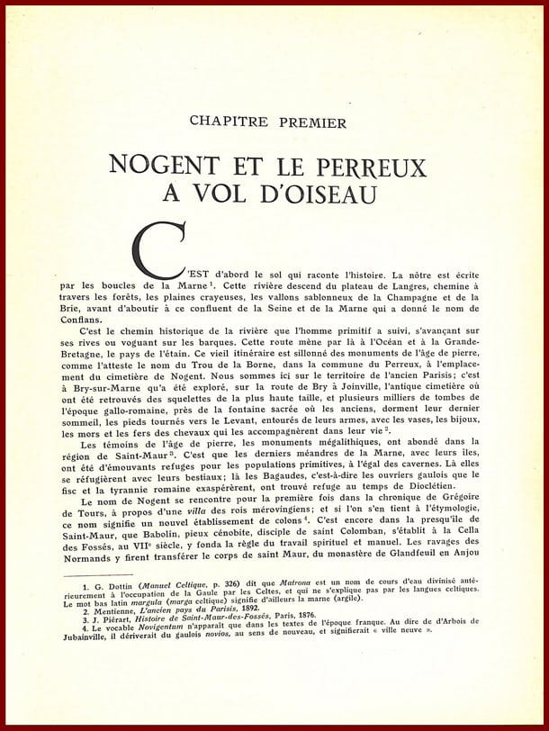 • Si notre histoire de Nogent est un peu différente, c’est qu’elle est celle d’un village très antique, groupé autour d’un clocher, tandis que l’histoire du Perreux demeure .surtout celle d’un château et de ses propriétaires, qui en firent un morcellement prospère en quelques années. L’histoire du Perreux est donc beaucoup plus simple, et d’actualité.