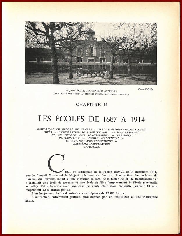 • I. — La mairie • II. Les écoles, de 1887 à 1914 • III. _ Les écoles depuis 1920 • IV. — Les cultes • V. — Les monuments • VI. — La Marne et ses charmes • VII. — La Marne (suite) •