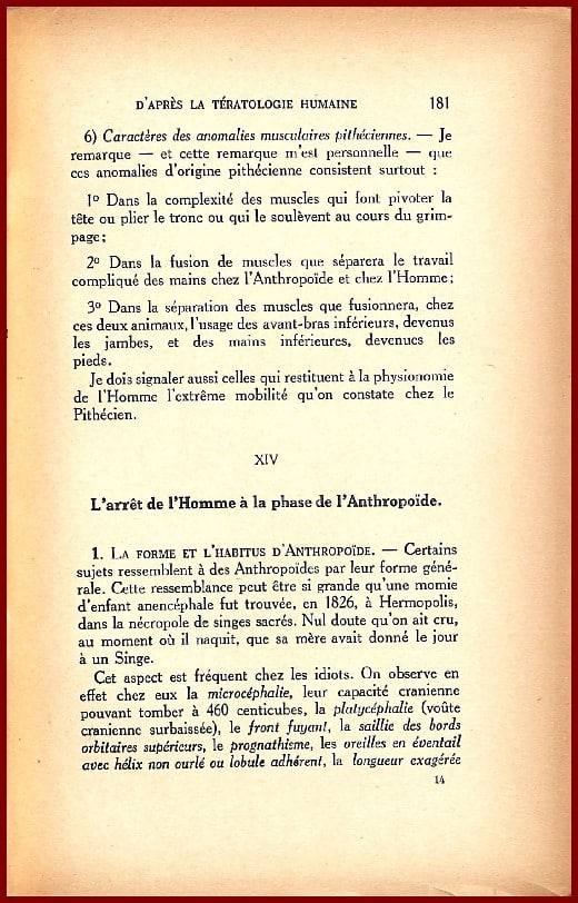 INTRODUCTION CHAPITRE PREMIER LA LIGNÉE DE L’HOMME, D’après Ernst HAECKEL, l’ascendance de l’Homme se compose de 17 espèces, savoir : la Monère, l’Amibe, un Radiolaire entièrement cellulaire, qu’il appelle synamibe, un Radiolaire à mésoglée ‘, qu’il appelle planœade, un Polype nageur, qu’il appelle gastrceade, un Ver primitif, qu’il appelle archelminthe, un Ver-poisson, dépourvu de crâne et analogue à VAmphi^ oxus, un Ver-poisson monorrhiné, analogue à la Lamproie, le Sélacien, le Dipneuste, le Batracien, un Protamniote tenant le milieu entre le Sozura et le Monotrème, le Singe lémurien, qu’il appelle prosimien, le Singe catarrhinien ou pithécien, le Singe anthropoïde, un Homme privé de parole, et un Homme sauvage, analogue à l’Australien et au Papou. De son côté, Mathias-DüVAL relève dans notre ascendance : le Poisson, le Reptile, le Marsupial, et un Quadrumane. Enfin Dhorn et Segdwick-Minot soutiennent que l’Annélide figure parmi nos ancêtres. Dans l’ouvrage qui va suivre, je me propose de démontrer que notre lignée ne comporte pas moins de vingt-neuf espèces ou variétés animales, savoir : 1. Le Microcoque. 2. La Monère. 3. L’Amibe. 4. L’Infusoire cilié. 5. L’Infusoire flagellé. 6. Un Protozoaire hybride, résultant de la fusion d’une Amibe avec un Infusoire flagellé. 7. Le Radiolaire entièrement cellulaire. 8. Le Radiolaire à mésoglée. 9. Le Polype. 10. La Méduse. 11. La Planaire. 12. L’Annélide errante. 13. L’Annélide sédentaire. TABLE DES PHOTOGRAPHIES Photographies 1,2 et 3. — L’arrêt de l’Homme à la phase de la Méduse. Monstres doubles humains ; 126 bis, Photographie 4. — L’arrêt partiel de l’Homme à la phase de l’Annélide. Enfant sans membres Photographie 5. — L’arrêt partiel de l’Homme à la phase du Poisson à nageoires. Fillette à nageoires antérieures Photographie 6. — L’arrêt partiel de l’Homme à la phase du Poisson à nageoires. Main rappelant la nageoire ancestrale . Photographie 7. — L’arrêt partiel de l’Homme à la phase du Poisson à nageoires. Pieds rappelant la nageoire ancestrale. Photographie 8. — L’arrêt partiel de l’Homme à la phase du Poisson. Homme à peau de Squale Photographie 9. — Arrêt partiel de l’homme à la phase du Monotrème ou du Marsupial Photographie 10. — L’arrêt partiel de l’Homme à la phase du Marsupial. Pénis bifide Photographie 11. — L’arrêt partiel de l’Homme à la phase du Pithécien. Enfant à queue Photographie 12. — L’arrêt partiel de l’Homme à la phase du Pithécien. Enfant à queue Photographie 13. — L’arrêt partiel de l’Homme à la phase du Pithécien. Homme à queue Photographie 14. — L’arrêt de l’Homme à la phase de l’Anthropoïde. Homme-anthropoïde, improprement appelé Homme- chien Photographie 15. — De l’Anthropoïde à l’Homme Photographie 16. — Un exemplaire contemporain de notre ancêtre négroïde. Cannibale de la Papouasie TABLE DES MATIÈRES partielle… INTRODUCTION Chapitre premier La lignée de l’Homme Chapitre II. Les lois de l’héréditologie I. — Les PROTOPLASMAS II. — Les plastides génératrices III. — Les plastidulisations IV. — Les plastides génératrices et la fécondation … V. — Le développement de l’homoncule Chapitre III. Les hérédités PREMIÈRE PARTIE LES ANCÊTRES DE L’HOMME D’APRÈS L’EMBRYOLOGIE Chapitre premier La loi de William Harwey 1. — Conceptions de Harwey, de Kielmayer, de Meckel, de Serres, de Darwin, de Haeckel et de BINET- Sanglé sur l’évolution embryonnaire 1. Conception de William Harwey 2. Conception de Karl Kielmayer 3. Conception de Friedrich Meckel 4. Conception d’Antoine Serres 5. Conception de Charles Darwin