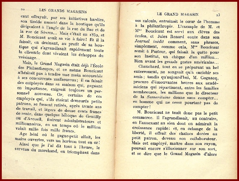 • Des poètes les ont chantés ; car les poètes se rencontrent partout. Par Émile Zola et Le Bonheur des Dames ils sont alliés aux Rougon-Macquart. Mais bien avant le maître naturaliste, Mme Rachilde, encore adolescente, avait consacré son premier roman à Monsieur de la Nouveauté, et avec Un homme si riche, M. Jacques Roujon a continué, naguère, par un roman édifiant et savoureux une série qui est loin d’être épuisée. Ce qui n’a pas empêché des techniciens, des sociologues, des économistes, des hygiénistes, des philosophes, des aspirants docteurs en droit, des fantaisistes, de leur consacrer des traités, des livres d’essai et de bonne humeur, des thèses, des pamphlets. Pour les Grands Magasins les inventeurs ont rédigé d’ardents et ingénieux projets ! Le théâtre, lui-même, a tiré d’eux des situations nouvelles et des personnages nouveaux. Et pour illustrer tous ces textes, les peintres et les dessinateurs, les sculpteurs et les ornemanistes, les architectes, ont multiplié les allégories, les compositions et les plans. Mais, à cet extraordinaire déploiement littéraire, artistique, économique et juridique, combien nous semblent préférables ces récits que trois générations de Français se sont transmis de bouche en bouche, cette tradition orale, où l’admiration se nuance d’envie, et qui maintient, dans le mystère d’un Walhala industriel et commercial, les héros de cette épopée que nous rencontrions, hier encore, vieillards multimillionnaires, mais riches, en plus, des souvenirs de leur jeunesse laborieuse et de leur prodigieuse réussite !